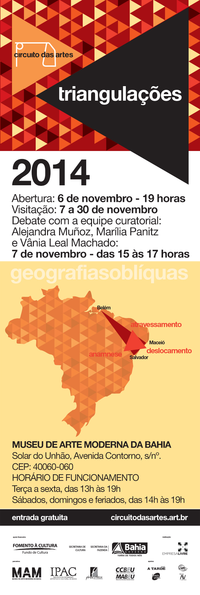 Chega no MAM, em Salvador a mostra do Circuito das Artes – Triangulações, da qual participo com uma obra. A mostra já passou por Maceió (AL) e Belém (PA) e traz 15 artistas de cada estado (BA, AL e PA). Ótima oportunidade para conhecer um pouco a cena de cada lugar que participa dessa edição! Vão ver!