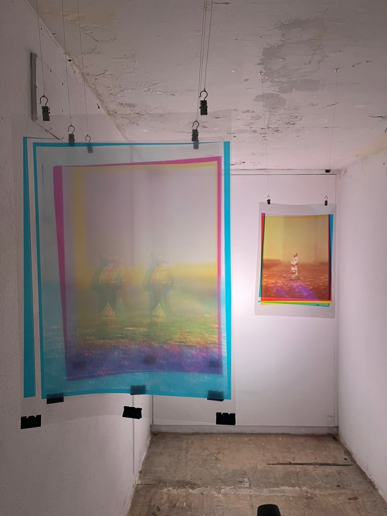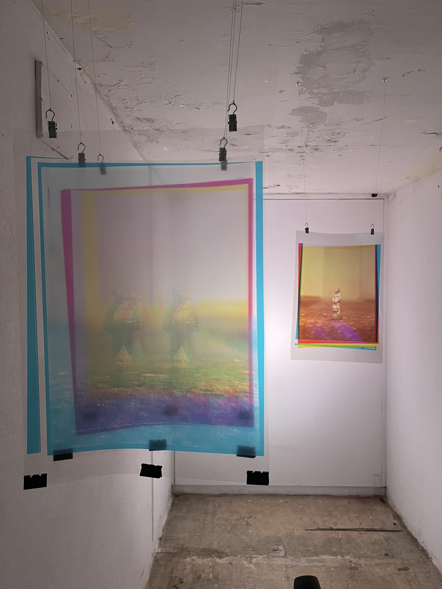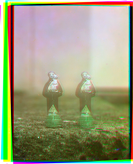 “Mijãozinho” e “Santo Antonio – bilocação”, Captura em filme preto e branco 9x12cm com Naturfarben Camera, digitalização e sobreposição de camadas de cor digital, impressão em acetato, 2025