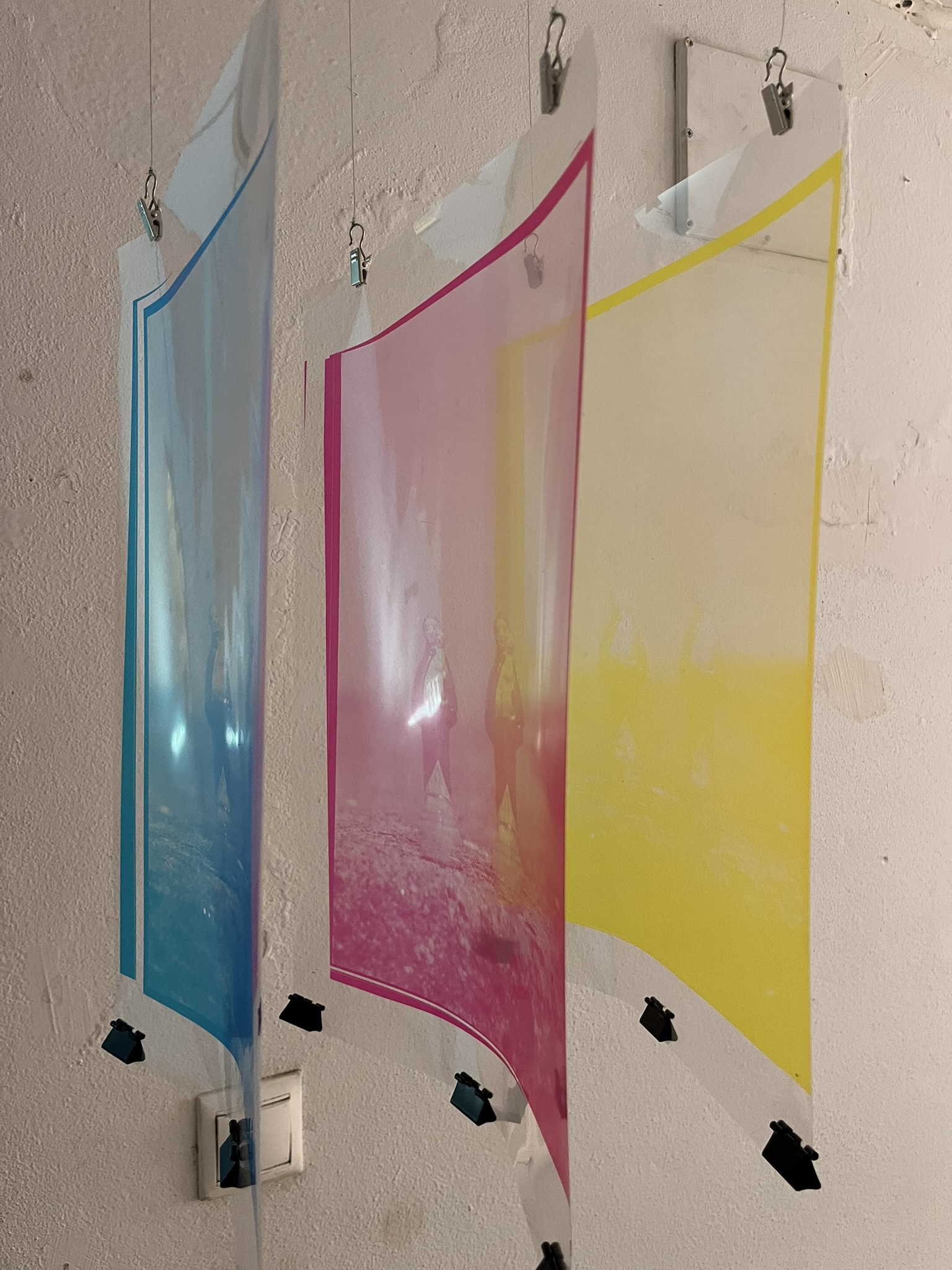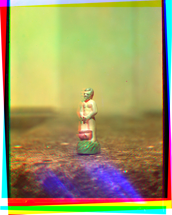 Com o Mijãozinho, a citação é um recurso utilizado, uma vez que remete à imagem da escultura presente em uma praça que frequentava na minha infância em Maceió, mas baseada no Manneken-Pis, de Bruxelas. Aqui, o repertório iconográfico se manifesta por meio da circularidade das imagens e de sua repetição como recurso criativo. Já na imagem de Santo Antônio, tive a intenção de jogar com o milagre da bilocação, associando-o ao procedimento fotográfico de dupla exposição, o que resultou na repetição da sua imagem, com aspecto fantasmagórico, no resultado final. As bordas da imagem evidenciam o processo de digitalização e de montagem das camadas para a impressão posterior em acetato. A escolha de imprimir em três folhas de acetato separadamente está relacionada ao princípio de captura das três cores da imagem. Tive a intenção de manter esta característica na apresentação deste trabalho no espaço expositivo.