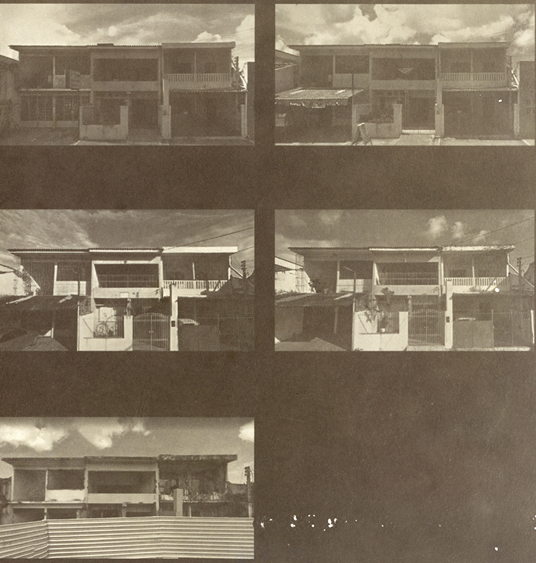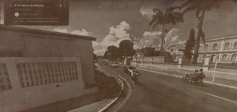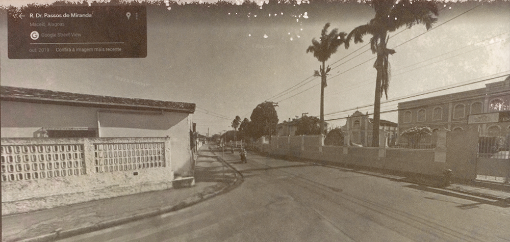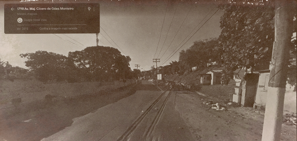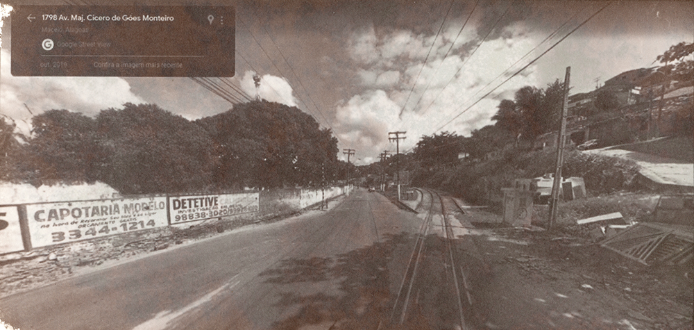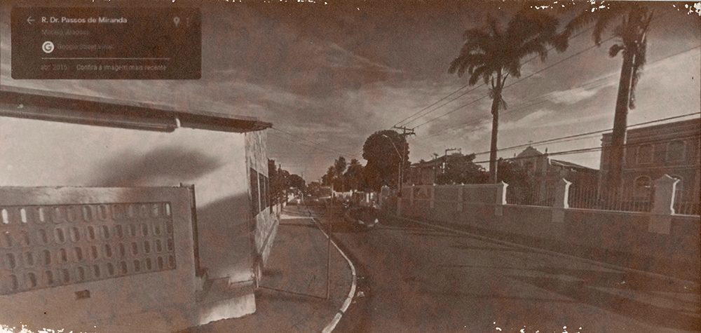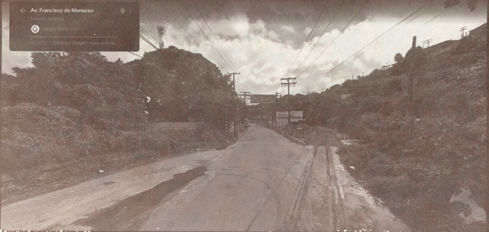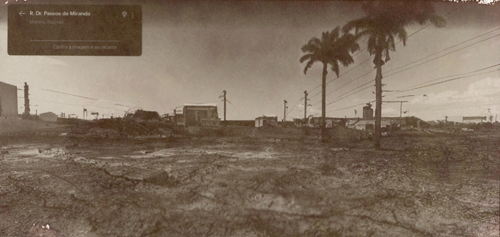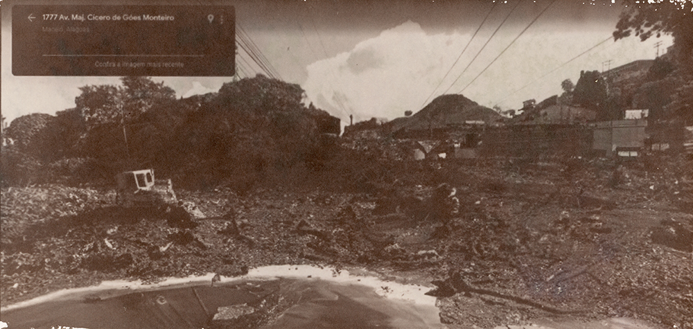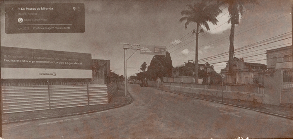 Série de imagens reveladas em papel salgado – técnica do século XIX – que tem como temática o contexto do afundamento de bairros de Maceió-AL, decorrentes da exploração de salgema pela Braskem em trechos em que havia falhas geológicas, provocando a instabilidade do solo. Em 2018, imóveis em alguns bairros começaram a ter rachaduras, levando muitas pessoas a deixarem suas casas transformando os bairros em fantasmas na cidade. Localizei um trecho de uma avenida que “sumiu do mapa” on-line e foi interditada, sendo proibida a circulação de carros e pedestres, portanto, sendo inviável a captura de imagens no local. Trata-se da avenida onde fica a Escola Estadual Nossa Senhora do Bom Conselho – prédio de 1877 tombado pelo patrimônio municipal e estadual -, onde há um trecho que deixou de aparecer como possível de circular por meio do recurso das vistas panorâmicas on-line, gerando um apagamento deste trecho da cidade. Ao registrar esta paisagem e refletir sobre o seu passado e futuro, capturei imagens (de 2011 a 2022) do último ponto visível no mapa e, para imaginar o seu futuro, as últimas imagem de cada vista são geradas por inteligência artificial a partir da descrição “o futuro da paisagem de uma cidade do nordeste do brasil que está afundando devido à extração de salgema”.